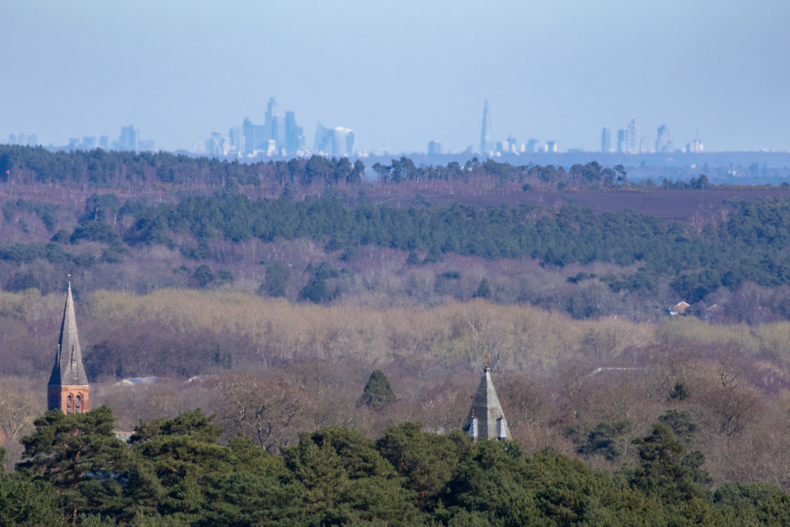 London skyline from Caesar's Camp Hill Fort, Farnham, Surrey, UK, 18 March 2026.